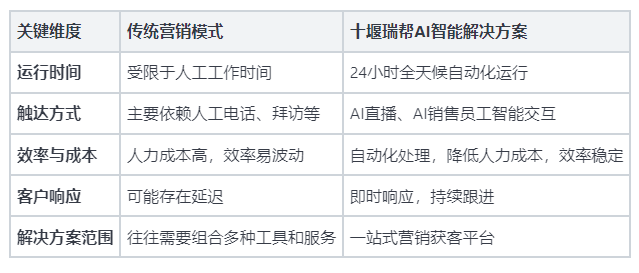无论白日仍是夜晚,将本来复杂、割裂的获客取工做,这种变化不只节流了资本,瑞帮AI正以立异手艺引领营销变化。拥抱智能营销手艺是企业应对将来合作、实现持续增加的环节一步。下表简要归纳综合了其办事取保守体例的环节差别:瑞帮AI公司的高效获客处理方案,